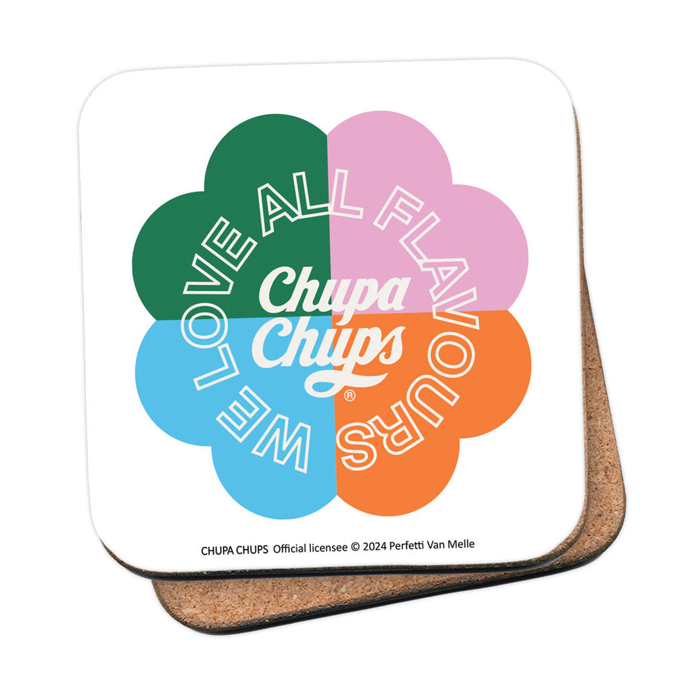 Show your love for all flavours with the Chupa Chups We Love All Flavours Coaster. This 10cm x 10cm coaster features a nonslip cork-backed design for stability and durability. Easy to wipe clean, it ensures hassle-free maintenance for your surfaces. Proudly produced in the UK, it celebrates the diversity of Chupa Chups flavours, adding a cheerful vibe to your home.