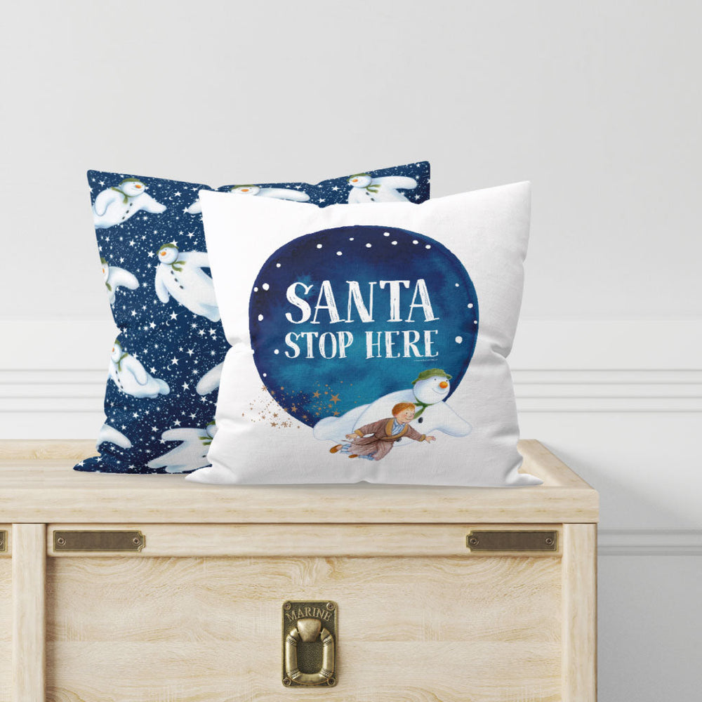 This festive season, make sure Santa stops at your house with this cute Santa Stop Here cushion! Featuring the iconic Snowman from Raymond Briggs' classic Christmas story, this soft-touch faux suede cushion is sure to get you in the holiday spirit. Measuring 40cm x 40cm, it's the perfect size to use as a decoration or to cuddle up with on cold winter nights. Plus, it comes filled with a plump microfibre inner for a lasting shape. So why not bring some Christmas cheer to your home with this lovely cushion? Proudly printed and produced in the UK.